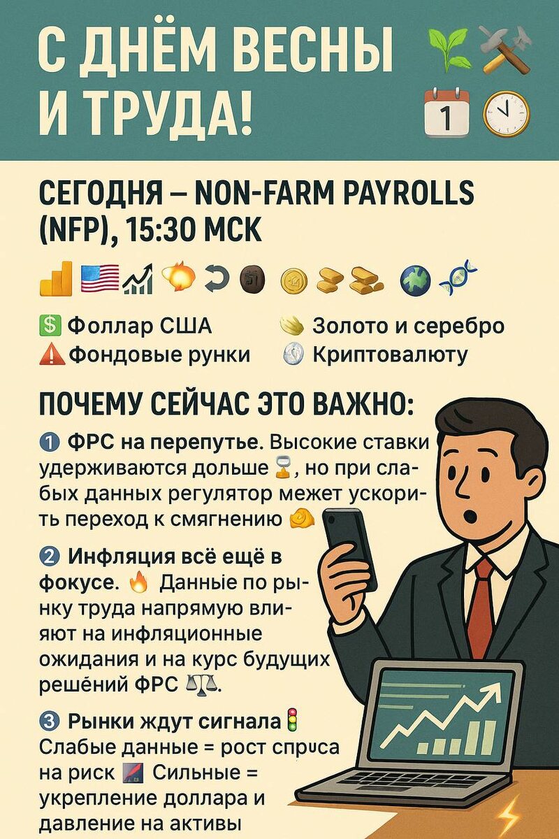 Сегодня в ряде стран продолжаются официальные выходные. Майские праздники традиционно ассоциируются с обновлением, перезагрузкой и переходом к новому деловому циклу 🔄📈. Тем временем, на финансовых рынках внимание сосредоточено на главном событии недели. ⸻ Сегодня — Non-Farm Payrolls (NFP), 15:30 МСК 📊🇺🇸🕒 Отчёт по рынку труда США — один из ключевых макроэкономических индикаторов. Результаты напрямую влияют на: 💵 доллар США 📈 фондовые рынки (S&P500, Nasdaq) 📉 доходности облигаций 🪙 золото и серебро 🧬 криптовалюту ⸻ Почему сейчас это важно: 1️⃣ ФРС на перепутье. Высокие ставки удерживаются дольше ⏳, но при слабых данных регулятор может ускорить переход к смягчению 💬🏦. 2️⃣ Инфляция всё ещё в фокусе. 🔥 Данные по рынку труда напрямую влияют на инфляционные ожидания и на курс будущих решений ФРС ⚖️. 3️⃣ Рынки ждут сигнала. 🚦 Слабые данные = рост спроса на риск 📊 Сильные = укрепление доллара и давление на активы развивающихся рынков 💣 ⸻ На что обратить внимание: ✅