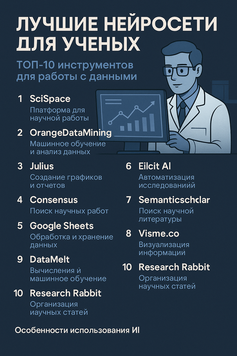 Современная наука сталкивается с огромными объемами сложных данных, требующих эффективных методов обработки и интерпретации. Нейросети и инструменты на основе искусственного интеллекта (ИИ) помогают ученым ускорить анализ, автоматизировать рутинные задачи и визуализировать результаты. В этой статье — 10 лучших нейросетевых решений, которые упростят работу с данными и повысят продуктивность исследований. Глубокое обучение и машинное обучение революционизируют научные исследования. Нейросети уже сегодня: Для чего: Анализ научных статей, генерация текста, поиск по PDF.