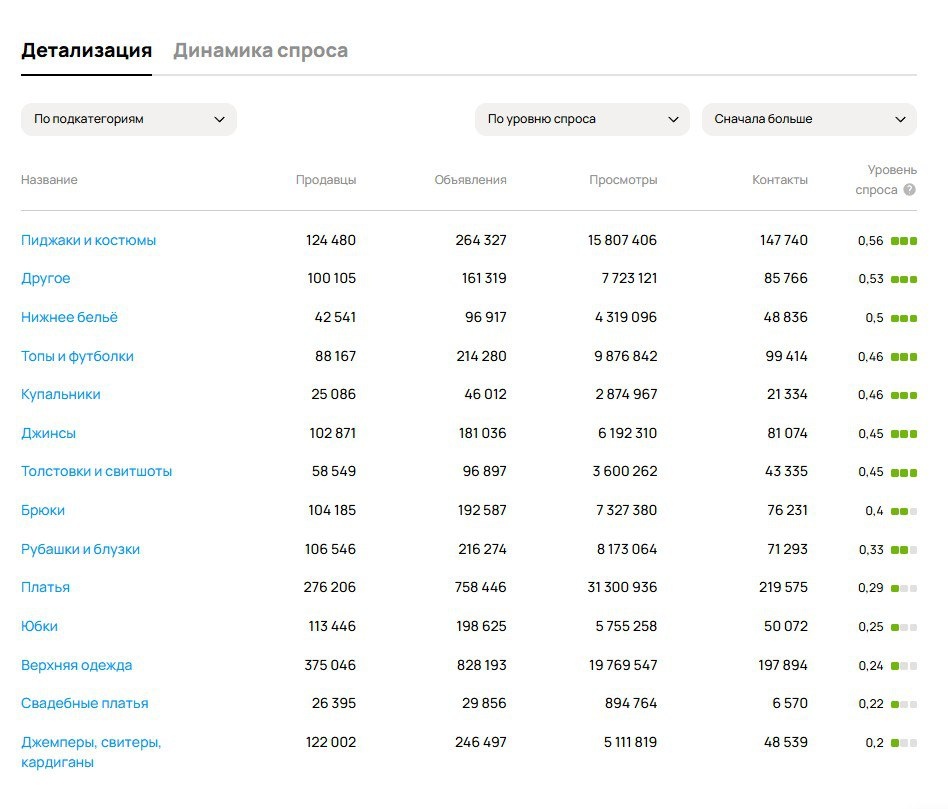 Внутри подкатегории Женская одежда - такая картина. Пиджаки и костюмы [берем на заметку] стабильно наверху по запросам пользователей Авито. Свитеры, логично по сезону, покидают чат. Вобщем, достаем из закромов Пиджаки, Другое, Нижнее белье и в продажу 👍