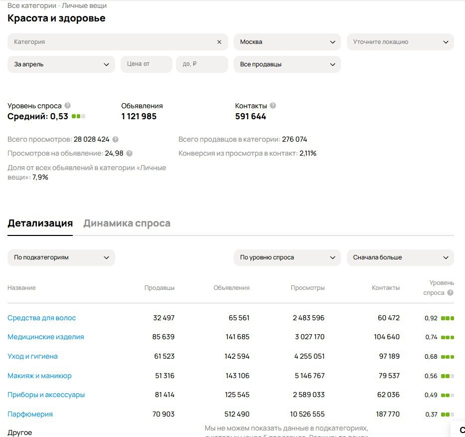 В Красоте и здоровье очень приличный спрос 0.92 на средства для волос. Понимайте, что речь не только о новых невскрытых упаковках. Народ за остатками шампуней и гелей для укладки идет на Авито и с удовольствием их покупает. А вот Парфюмерия внизу списка. Признаюсь, думала спрос на нее активный. А тут 0.37 всего 🤔