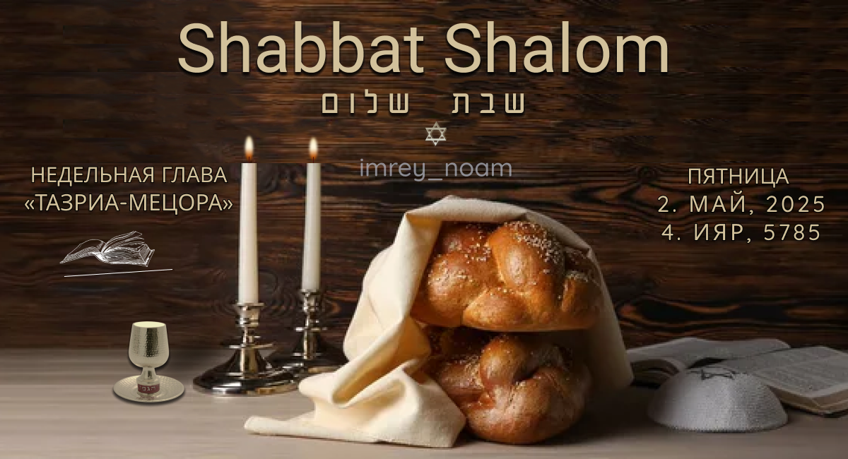 Шаббат Шалом! Доброй и мирной субботы в кругу родных и близких! Недельная глава «Тазриа-Мецора» Ознакомиться с недельной главой можно здесь: https://imrey.org/tag/глава-тазриа-мецора/ Время зажигания свечей/ исход шаббата Иерусалим — 18:40/20:00 Тель-Авив — 19:00/20:02 Хайфа — 18:53/20:03 Киев — 20:02/21:19 Минск — 20:25/21:49 Москва — 19:52/21:22 Берлин — 20:17/21:38 Лондон — 20:08/21:26 Нью-Йорк — 19:35/20:40 Париж — 20:50/22:04 Прага — 20:05/21:21 Баку — 19:19/20:23 Алматы — 18:37/19:44