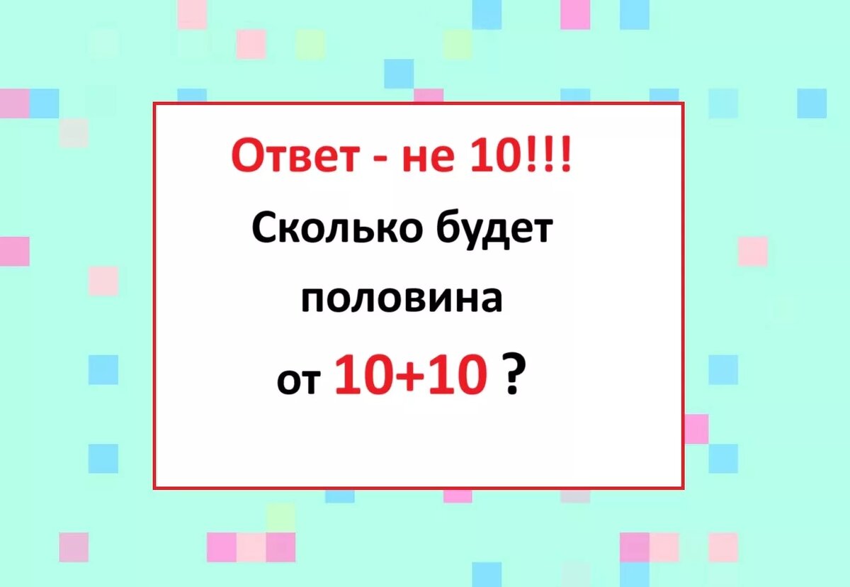 Многие вычисляют половину от (10+10), получая 20:2=10, но ведь скобок в задании нет. Значит, сначала нужно вычислить половину от первой десятки, и к ней прибавить вторую, вот так: 10:2+10=15.