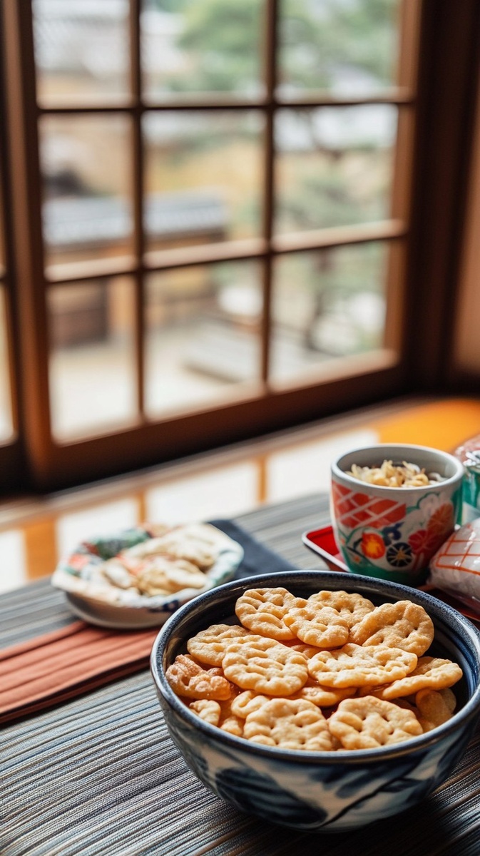 Создано на основе запроса: Japanese snacks on a low hotel table, focus on kaki no tane (rice crackers with peanuts) and kinako candy, retro