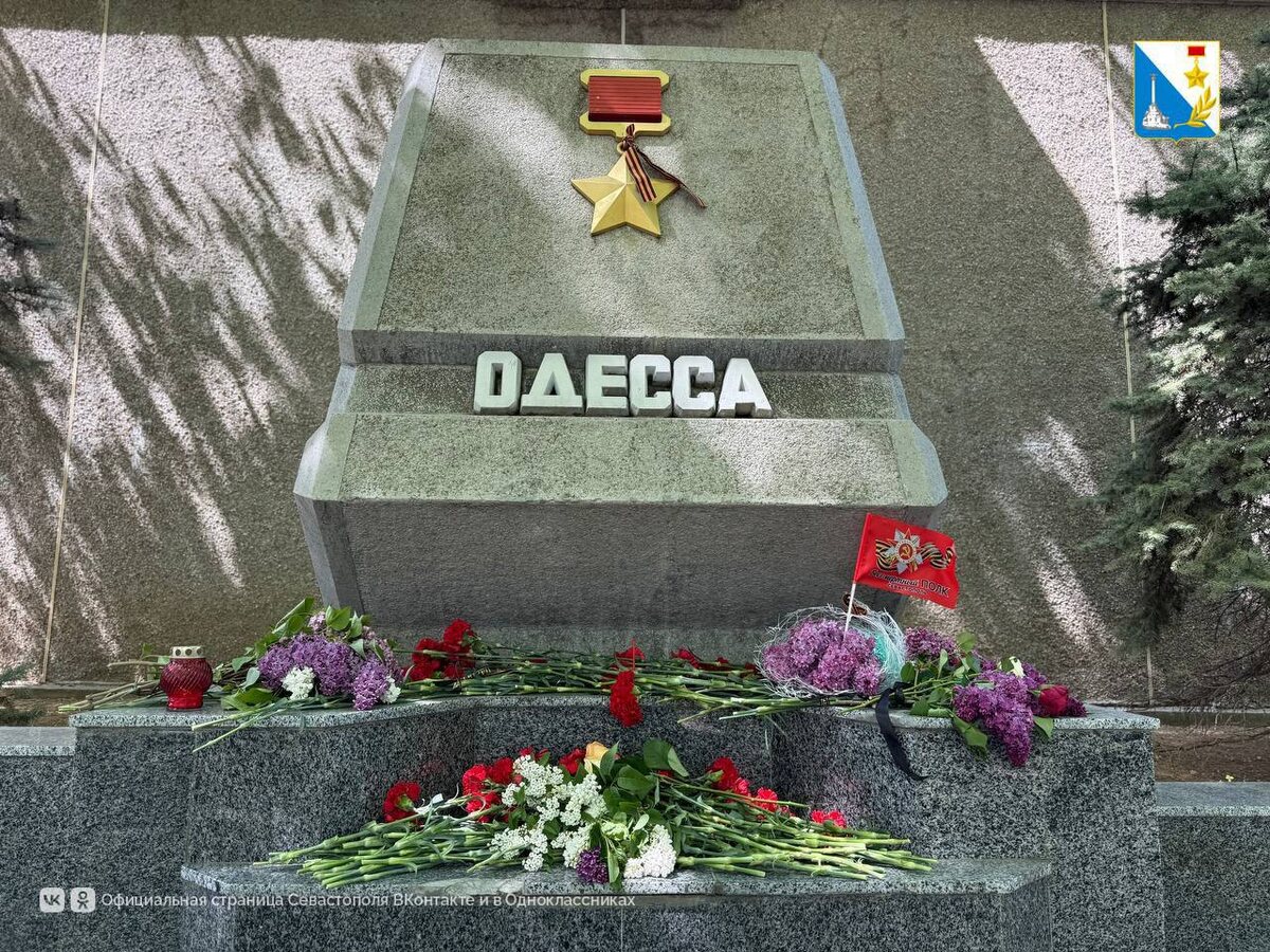 Севастопольцы несут цветы к памятному знаку «Одесса» на аллее городов-героев в память о всех невиновно убиенных 2 мая 2014 года в Доме Профсоюзов в Одессе. Правительство Севастополя