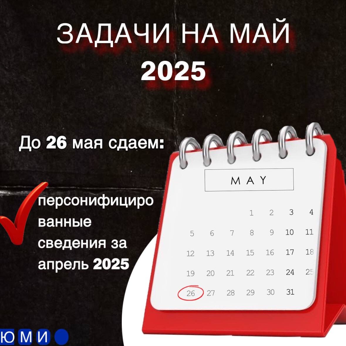 📊 Май — время выдохнуть и восстановиться после квартальной отчётности После напряжённого закрытия года и сдачи отчетов за 1 квартал — в мае можно немного перевести дух. Но расслабляться полностью не стоит: 🗓 Задачи на май 2025: До 26 мая необходимо сдать: ✅ Персонифицированные сведения за апрель 2025 года Следим за сроками — и май действительно станет месяцем восстановления, а не новых штрафов.