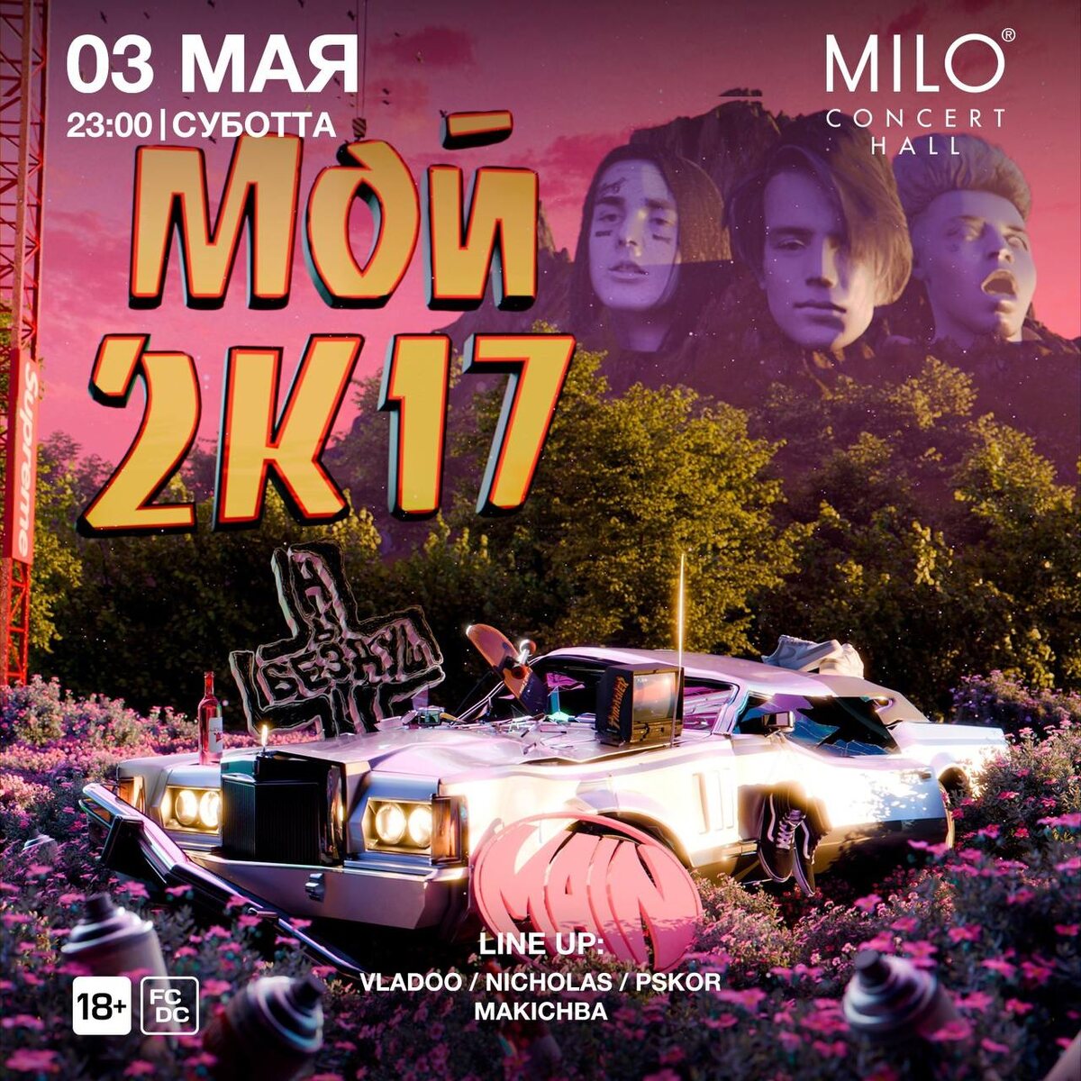 3 мая — масштабная вечеринка Мой 2к17 💜 Узкачи + найки. Трешер на груди. Розовый закат на экранах. И любимая музыка ушедших лет от известных исполнителей. Line up: Vladoo / Nicholas / Pskor Makichba Milo concert hall #яместный