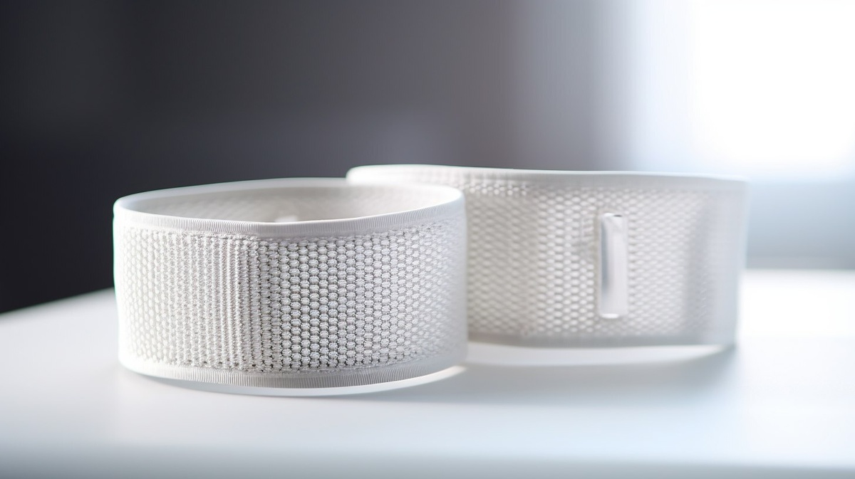Создано на основе запроса: two mesh armbands side by side on a clean white table, realistic fabric texture, printed label stitched on each