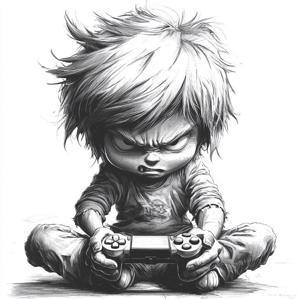 Создано на основе запроса: stupid cartoon character playing video games, silly face, abnormal body, black and white line art isolated from