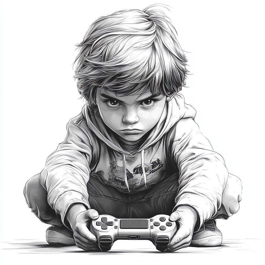 Создано на основе запроса: cartoon character playing video games, silly face, abnormal body, black and white line art isolated from white