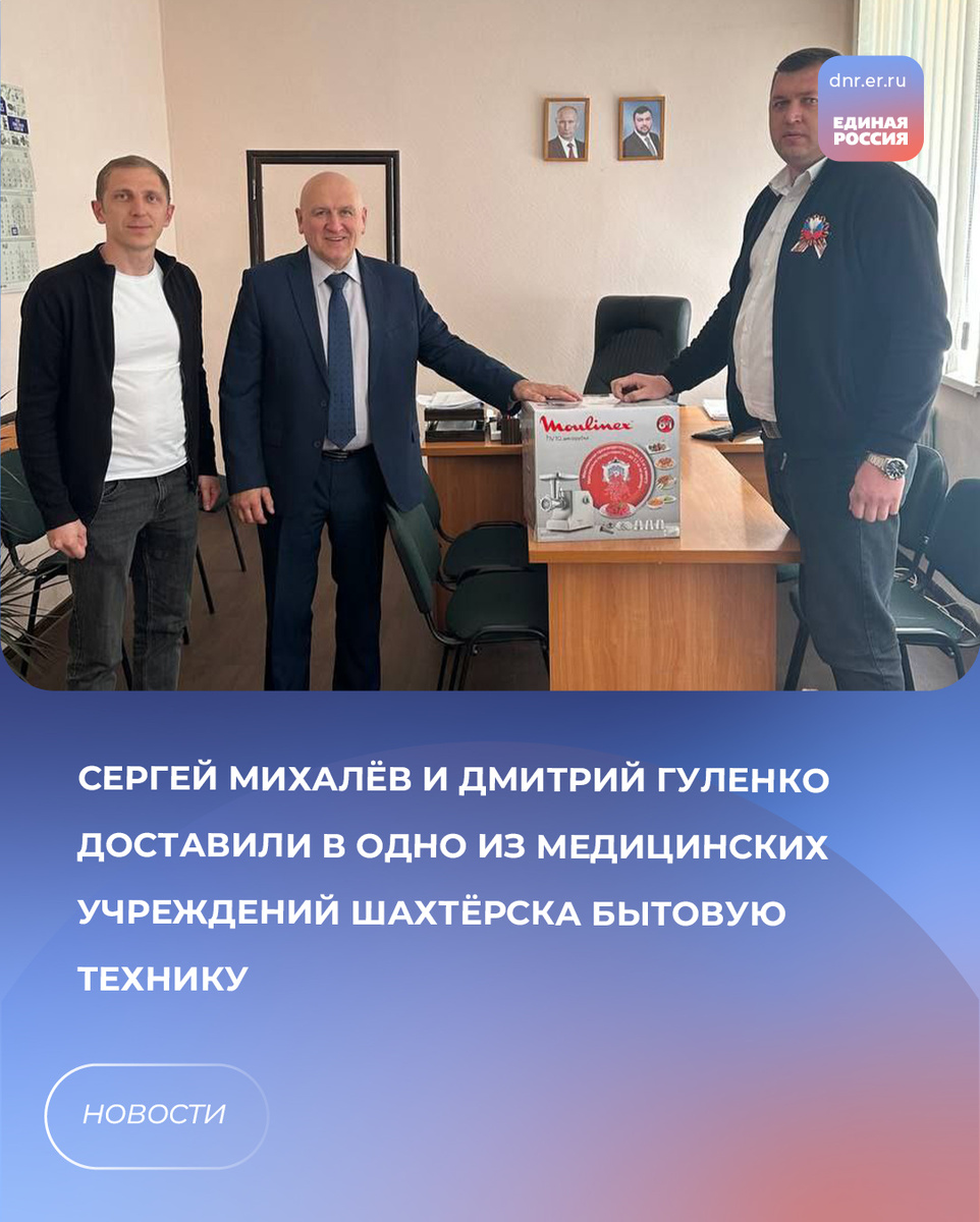 В преддверии 80-летия Великой Победы депутат Народного Совета ДНР Сергей Михалёв совместно с депутатом Шахтёрского городского совета Дмитрием Гуленко посетили одно из медицинских учреждений Шахтёрского муниципального округа, чтобы оказать необходимую помощь тем, кто нуждается в поддержке. Конечно, накануне великого праздника они пришли не с пустыми руками – с полезными подарками: привезли бытовую технику, которая поможет в приготовлении пищи для военнослужащих и пациентов, находящихся на лечении в больнице. Также депутаты пообщались с главным врачом больницы, обсудив, чем ещё можно помочь пациентам, а также пожелали всем им скорейшего выздоровления. «Мы регулярно оказываем всестороннюю помощь тем, кто защищает Донбасс. Эти встречи необходимы не только для поднятия боевого духа, но и для своевременного реагирования на возникающие проблемы. Наша обязанность – обеспечить пациентам достойное восстановление», – отметил Сергей Михалёв. #ЕРДНР #МыВместе #ЕдинаяРоссия