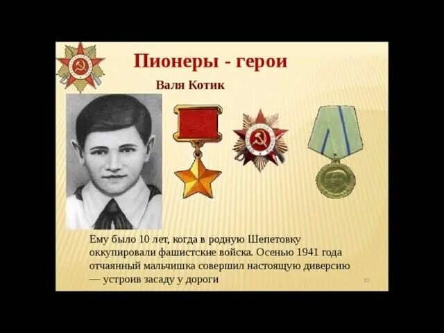 Валентин Александрович Котик — советский пионер-герой, участник Великой Отечественной войны, партизан-разведчик. Самый молодой Герой Советского Союза — на момент гибели ему едва исполнилось 14 лет, звание присвоено посмертно. Родился в селе Хмелёвка Шепетовского района, Каменец-Подольской (с 1951 года и по настоящее время — Хмельницкой) области Украины в семье служащего. К началу войны он только перешёл в пятый класс школы №4 города Шепетовка, но с первых дней войны начал бороться с немецкими оккупантами. Осенью 1941 года вместе с товарищами, устроив засаду, убил главу полевой жандармерии близ города Шепетовки, подорвав гранатой машину, в которой ехал глава жандармерии. С 1942 года принимал активное участие в партизанском движении на территории Украины. Сначала был связным шепетовской подпольной организации, затем участвовал в боях. С августа 1942 года — в партизанском отряде имени Кармелюка под командованием Ивана Алексеевича Музалёва, был дважды ранен. В октябре 1942 года обнар