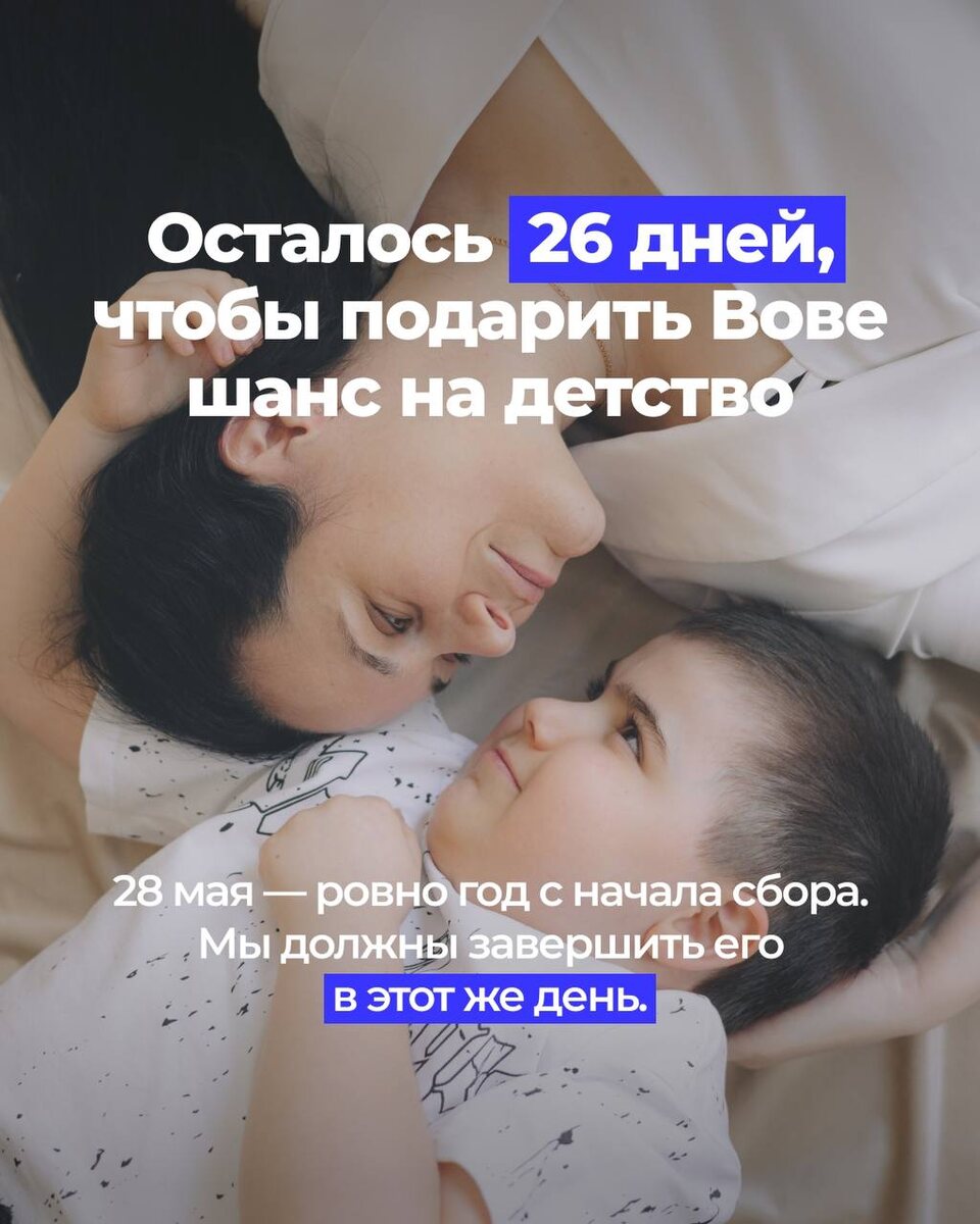 ЭКСТРЕННЫЙ И МАСШТАБНЫЙ СБОР! Я молю Вас сделать рывок и закрыть сбор до 28 мая. Что будет «завтра» не скажет ни один врач и если не успеть, Вова окажется в инвалидном кресле, а дальше летальный исход. ⏳26 ДНЕЙ 👥208 140 человек по 500 руб 🚨 или любая посильная сумма Сейчас на счету каждый день. Вова Соловьев, 8 лет, Диагноз: Миодистрофия Дюшенна. Все документы, фонды и перевод с зарубежных карт по ссылке в описание @savevova2024 Сумма сбора: 262 000 000руб. Осталось собрать: 104 069 740руб. НАМ НУЖНА ПОДДЕРЖКА ЛЮДЕЙ!Отправьте это видео своему другу, выставите в статусы WhatsApp и телеграмм. Реквизиты: Перевод по номеру тел.+7(918)499-99-81 Заира Масхудовна С. (Мама) В комментариях к платежу: Вове на лечение.