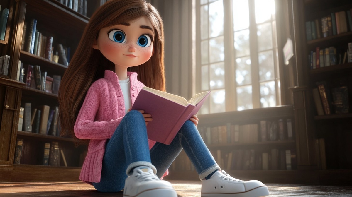 Создано на основе запроса: 3D render of a 10-year-old girl with blue eyes and brown hair, wearing a pink cardigan, blue jeans, and white sneakers. She is sitting in a quiet corner of an old library, gazing dreamily at an open book in her lap. Her expression is full of wonder and imagination. The atmosphere is warm and magical, with rays of light gently shining through tall windows --- Автоперевод: 3D рендера 10-летней девочки с голубыми глазами и каштановыми волосами, в розовом кардигане, голубых джинсах и белых кроссовках. Как тебе это изображение? 🤔 https://dzen.ru/id/65c0c65c86e4f837c27b24d7 #ИИ #AI #нейросеть #midjourney #art