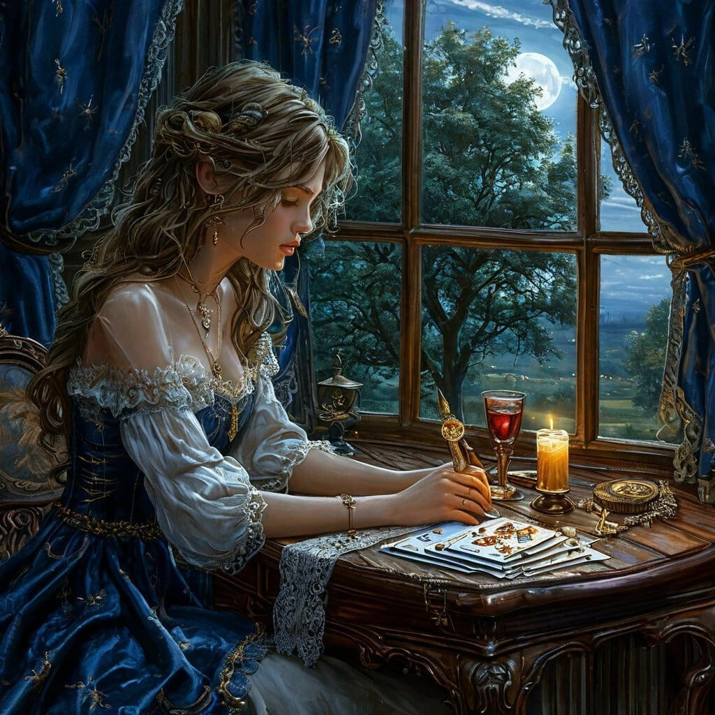 Лунный свет, проникающий сквозь кружевные занавески, серебрил потемневшие от времени карты таро — наследство бабушки Веры. "Когда запутаешься в сердечных делах, они подскажут путь," — словно наяву услышала Светлана её теплый голос. Старая гадалка, мудрая и проницательная, бабушка всегда видела то, что скрывалось за внешней стороной вещей. За окном шумел клён, его листва отбрасывала причудливые тени на стены комнаты. Тот самый клён, под которым три года назад началась их история с Никитой. Осенний ветер играл ветвями, как тогда, в их первый вечер, когда воздух пах грозой и предчувствием чуда. Светлана бережно перебирала карты, чувствуя их особенное тепло. Каждая хранила истории сотен судеб, тысячи ответов на вопросы о любви. "Что я действительно чувствую к Никите?" — спросила она, позволяя картам скользить между пальцами. "Помоги мне увидеть правду, бабуля." Первая карта — Двойка Кубков — легла на темно-синий бархат. Светлана прикрыла глаза, позволяя архетипу таро раскрыться в сознании.