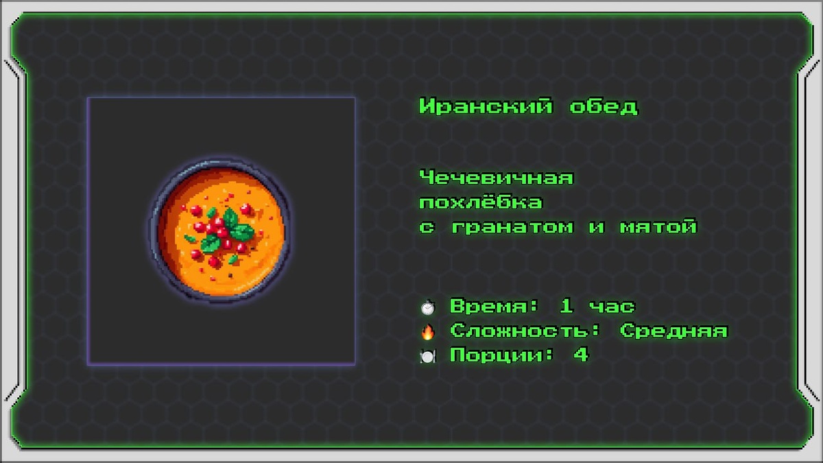 Иранский обед Чечевичная похлёбка с гранатом и мятой Этот креативный рецепт основан на традиционных иранских супах, но дополнен неожиданным сочетанием граната и свежей мяты, придающими блюду сладко-кислый аромат и освежающую нотку. Он объединяет в себе насыщенность бобовых, пряности Ближнего Востока и фруктовую кислотность. Отличный вариант для сытного, но лёгкого обеда без мяса. Информация о рецепте: ⏱️ Время: 1 час 🔥 Сложность: Средняя 🍽 Порции: 4 Ингредиенты: Для супа: • 🌱 Чечевица красная — 200 г • 🧅 Лук репчатый — 1 штука • 🥕 Морковь — 1 штука • 🍅 Томатная паста — 1,5 столовые ложки • 🧄 Чеснок — 3 зубчика • 🫒 Оливковое масло — 2 столовые ложки • 🧂 Соль — по вкусу • 🌶 Куркума — ½ чайной ложки • 🌶 Корица молотая — ¼ чайной ложки • 🌿 Зира (кумин) — 1 чайная ложка • 💧 Вода или овощной бульон — 1,2 литра Для ароматной заправки: • 🧄 Чеснок — 1 зубчик • 🌿 Сушётая мята — 1 чайная ложка • 🫒 Оливковое масло — 1 столовая ложка Для подачи: • 🍇 Гранатовые зёрна — 3