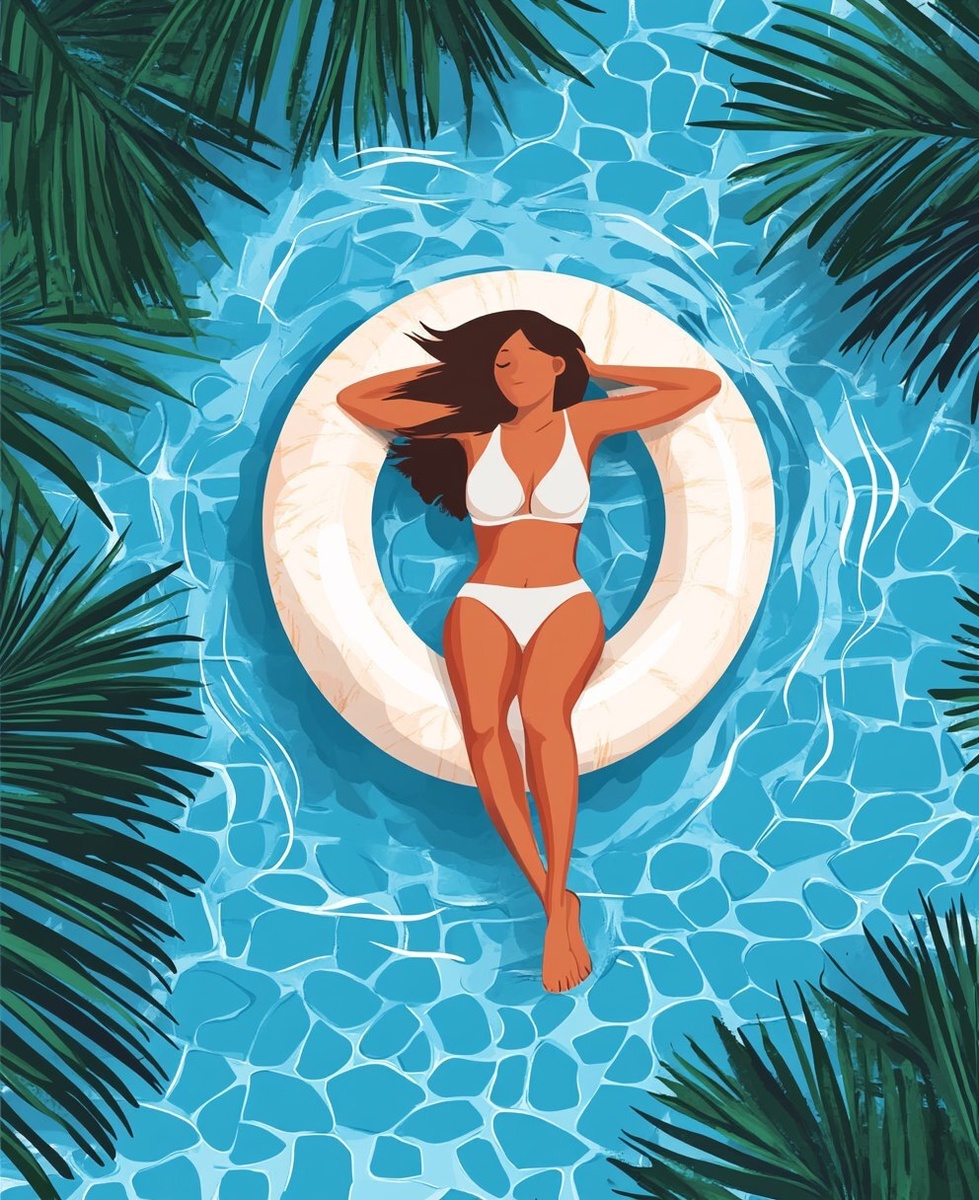 Создано на основе запроса: A flat illustration of a woman relaxing on an inflatable ring in the swimming pool, with palm leaves and water ripples adding to its summer feel. The background is a blue patterned surface, creating a contrast between warm colors and cool blues. This top-down view captures her relaxed posture as she lounges by the side of the swimming pool. --- Автоперевод: Плоская иллюстрация женщины, отдыхающей на надувном кольце в бассейне, с пальмовыми листьями и водой, добавляя к летнему ощущению. Какое твое мнение? 🤔 https://dzen.ru/id/65c0c65c86e4f837c27b24d7 #ИИ #AI #нейросеть #midjourney #art