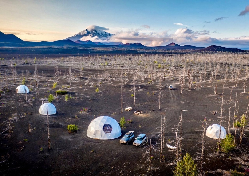 За 10 дней мы увидим лучшее и даже попадем в удалённый и уникальный район Толбачинских вулканов, куда редко добираются туристы. Здесь нет гостиниц и мы проведем несколько ночей в уютных шатрах глэмпинга под звёздным небом с видом на вулкан. Да, шатры на фото- наше место ночевок!