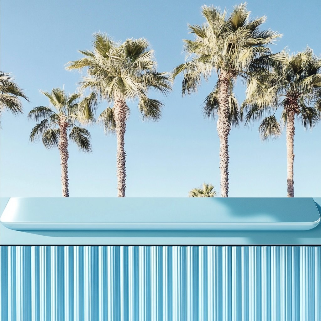 Создано на основе запроса: a light metallic pastel blue counter with grooves on its body .the counter is horizontal. The background has real palm trees with light blue sky.