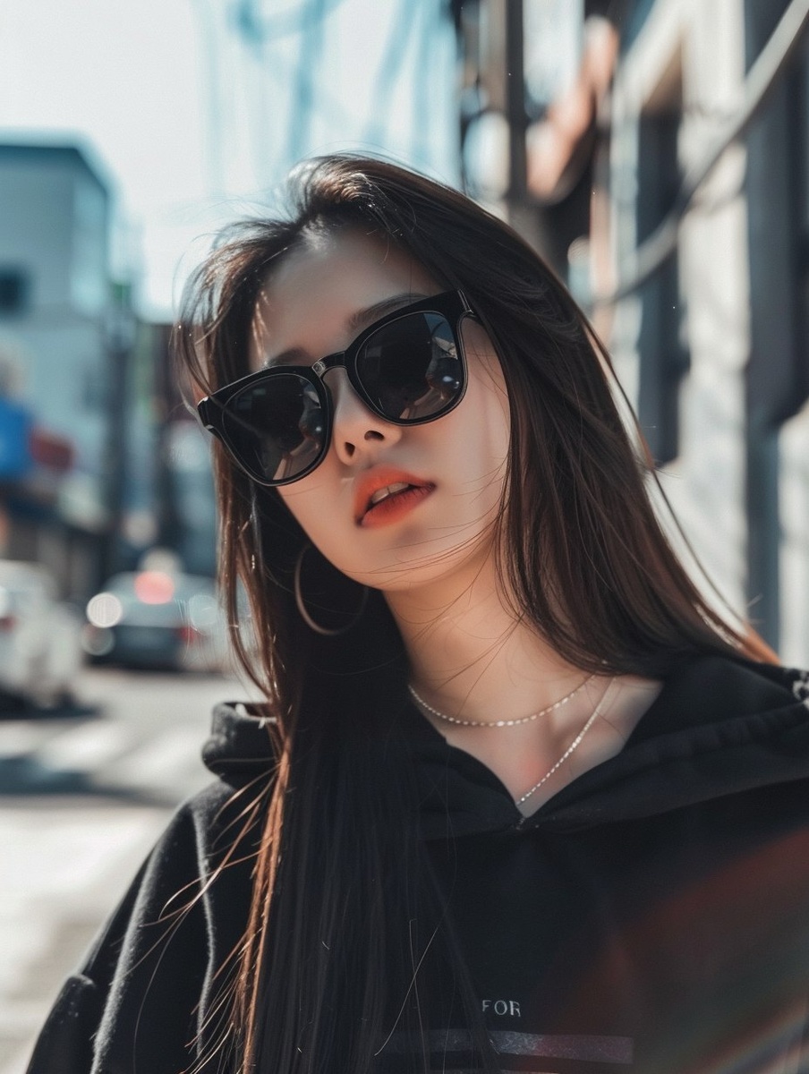 Создано на основе запроса: a fashionable Korean woman taking a selfie, wearing trendy sunglasses and minimal streetwear, sharp look, clear