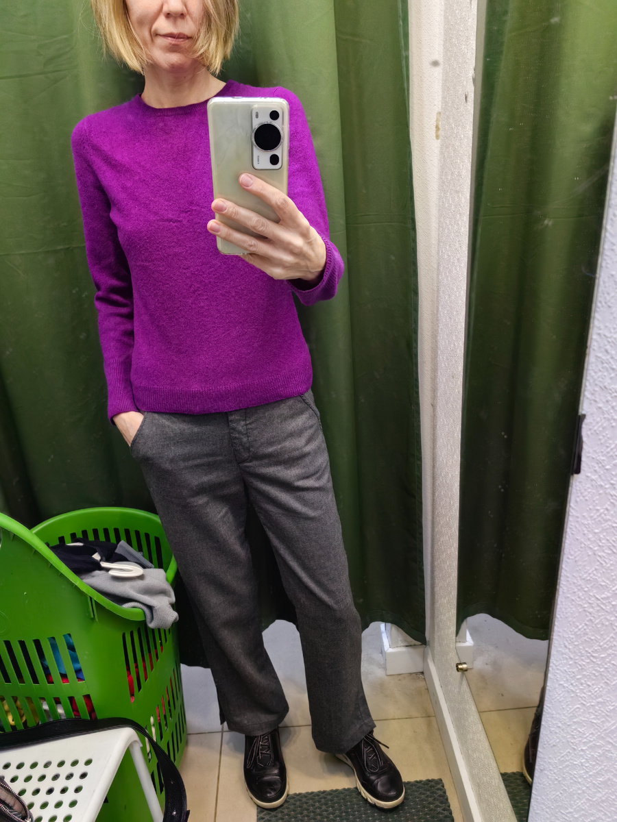 Добрый день, меня зовут Тоня и сегодня я расскажу вам о том, что увидела в комиссионном магазине. Выбралась на пол часа, поэтому все очень быстро, бегом, практически без примерок. Но все же нашла несколько интересных вещей и даже купила кое-что для себя из корзины за 1 рубль. Вот так я пришла, пальто уже сняла, надевать снова для фотографии не стала) На мне кашемировый свитер и брюки из 100% тонкой шерсти от bilancioni. Это крутой итальянский бренд, они вообще-то шьют для мужчин, но эти брюки шили для меня 🤣 я их надела и сразу поняла, что куплю. Все, включая пальто - о нем рассказала отдельно в статье куплено в секонд хэнде, только обувь куплена в фирменном магазине. Итак, смотрим, что я смогла найти среди предложенного. Тонкая майка с красивым декором спереди, состав - шёлк 🔥 Бренд британский, с забавной историей. Начинался он как фешн бренд, в 1990 году, но сейчас он известен как косметический бренд😁 С самого начала, к совершенным покупкам одежды предлагался крем для рук,