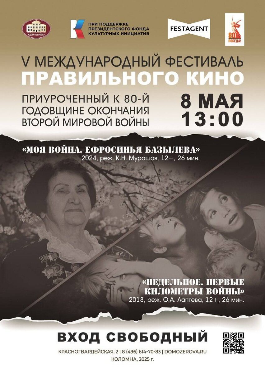 8 мая в 13:00 в Доме Озерова в рамках проведения V Международного фестиваля правильного кино, приуроченного к 80-й годовщине окончания Второй мировой войны, состоится показ документальных фильмов "Моя война. Ефросинья Базылева", "Недельное. Первые километры войны". В 2025 году МФПК проводится при поддержке Министерства культуры РФ. Программа кинофестиваля предусматривает показ не только художественных и документальных фильмов о Великой Отечественной войне, но и широкую панораму картин разных жанров. Международный фестиваль Правильного кино - один из видов творческой коммуникации с молодёжью и подрастающим поколением. Он организован с целью приобщения подростков к изучению истории нашего Отечества, знакомства зрителей с новыми картинами и их создателями, а также усиления культурно-просветительской роли кинематографа. Вход свободный. 12+