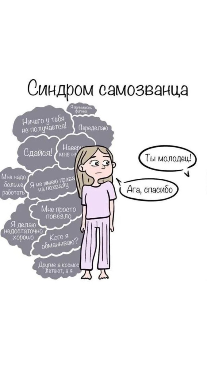 — Самозванец! — От самозванца слышу!.. Как понять, есть ли у вас синдром самозванца? Синдром самозванца — это некий набор переживаний человека, который убежден, что не справится с поставленной перед ним задачей, его разоблачат и узнают, что он на самом деле из себя ничего не представляет. ❗Как же распознать этот синдром у себя? Вот несколько пунктов, по которым вы сможете это определить: 1️⃣Страх неудачи, страх сделать ошибку. 2️⃣Сравниваете себя с другими людьми. 3️⃣Сомневаетесь, что у вас получится. 4️⃣Фокусируетесь на неудачах. 5️⃣Завышенные требования к себе (перфекционизм). 6️⃣Постоянно сомневаетесь в своей профнепригодности. 7️⃣Постоянно ждете позитивной оценки. 8️⃣Обесцениваете свои достижения(да мне просто повезло, так сложились обстоятельства и т. д.). Узбагойтесь!) 70% людей испытывают синдром самозванца в какой-то момент своей карьеры. Синдром самозванца всегда возникает, когда мы выходим из зоны комфорта. Смысл этой техники — посмотреть на своих внутренних самозванцев под