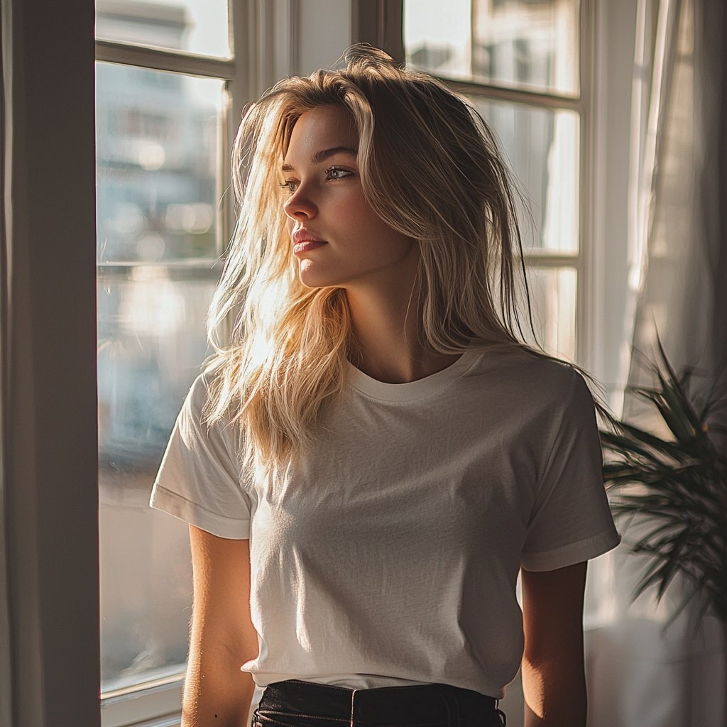 Создано на основе запроса: Lifestyle image of young woman using [T-SHIRTS], minimalist modern apartment, morning sunlight through large