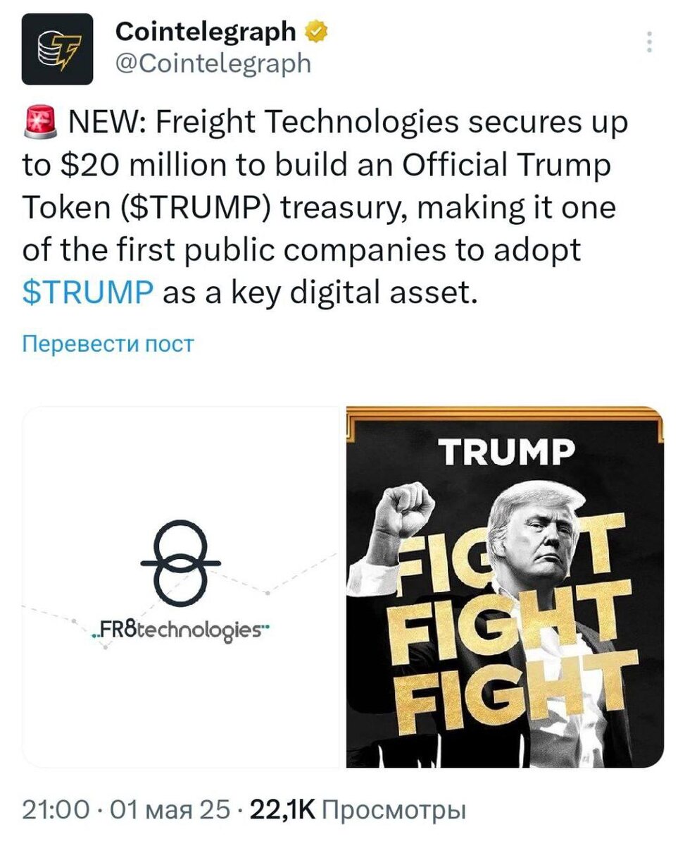 🔠🔠🔠🔠 Компания Freight Technologies планирует сформировать стратегический резерв в токенах TRUMP, который будет размещён на казначейском счете. На эти цели уже привлечено $20 миллионов. Возможные причины: Инвестиция – если $TRUMP вырастет в цене, компания получит прибыль. Партнерство/использование – токены могут применяться в платежах или экосистеме компании. Поддержка проекта – $TRUMP связан с политикой, это может быть способом заявить о лояльности.