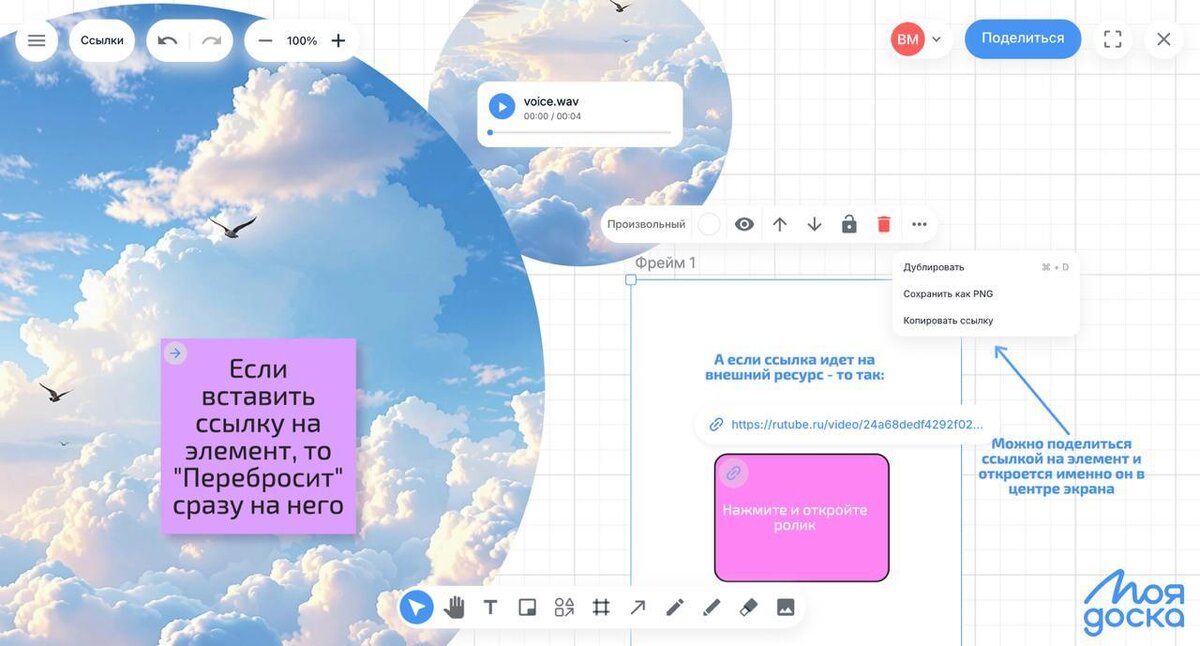 ⚡️Обновление — Ссылки! Теперь к элементам можно крепить ссылки! А также можно делиться ссылками на элементы доски! Но и это не все: если скопировать ссылку на элемент доски и прикрепить ее к элементу... то получится кнопка, которая при нажатии будет перебрасывать вас к нужной части доски, где расположен тот элемент, у которого скопирована ссылка. Немного запутанно? Не беда, давайте еще раз: 1) Если вам надо прикрепить ссылку на какой-то внешний ресурс к элементу доски — выбираете его, жмете на кнопку с ссылкой на панели, вставляете и сохраняете. Вуаля: на элементе появится кнопка с ссылкой. 2) Если надо, чтобы при открытии доски сразу открывался конкретный элемент — выбираете его, нажимаете на три точки на панели и выбираете «Копировать ссылку». Потом этой ссылкой делитесь (важно, чтобы либо у человека был доступ к доске, либо доска уже была открытой для всех по ссылке). 3) Ну а если надо прямо на доске перебросить из одного места в другое, то берете ссылку из предыдущего пункта,