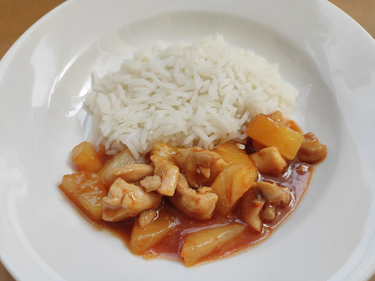Если вы любите смешение вкусов, сочетание кислого и сладкого, а иногда ещё и острого, то вы настоящий гурман! Предлагаю внести в свое меню немного экзотики и попробовать ананас в разных блюдах: Филе куриного бедра 4 шт, банка ананасов, 2 зубчика чеснока, стакан риса басматти. Для соуса: 5 ст.л. соевого соуса 2 ст.л. томатной пасты 1 ст.л. рисового уксуса 2 ч.л. кукурузного крахмала 1 ч.л. сахара 0.5 банки сиропа от ананасов Смешать все ингредиенты в чашке. Курицу нарезать небольшими кусочками, обжарить в растительном масле примерно 10 минут. Добавить раздавленный чеснок, продолжать поджаривают, помешивая, выпаривая жидкость. Когда сок почти выпарится - добавить банку ананасов, нарезанных кусочками и жарить ещё 5 минут Лучше брать уже нарезанные, они дешевле и сократят время приготовления . Добавить к курице соус и довести до кипения, дав соусу загустеть. Попробуйте соус, сейчас самое время добавить кислинки или сладости по вашему вкусу. На гарнир отварить рис басматти в кипящей воде 1