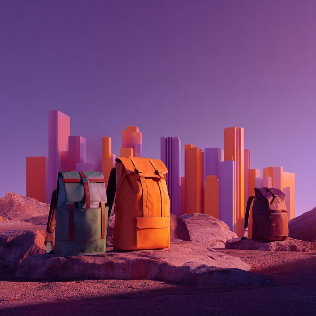 Создано на основе запроса: A land scape of a city made of backpacks, full HD minimal style, fashion editorial, vogue editorial