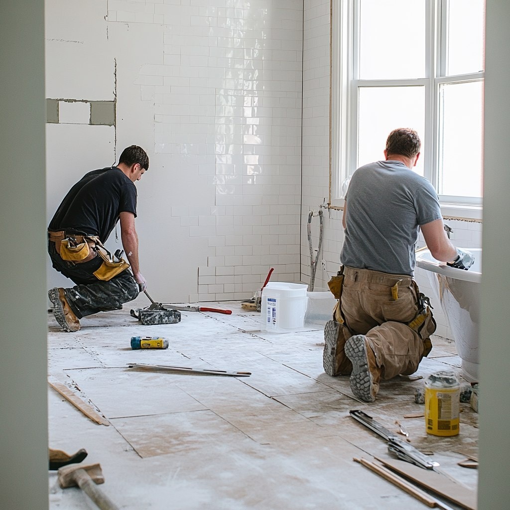 Создано на основе запроса: a homeowner working on a bathroom and a contractor with tools