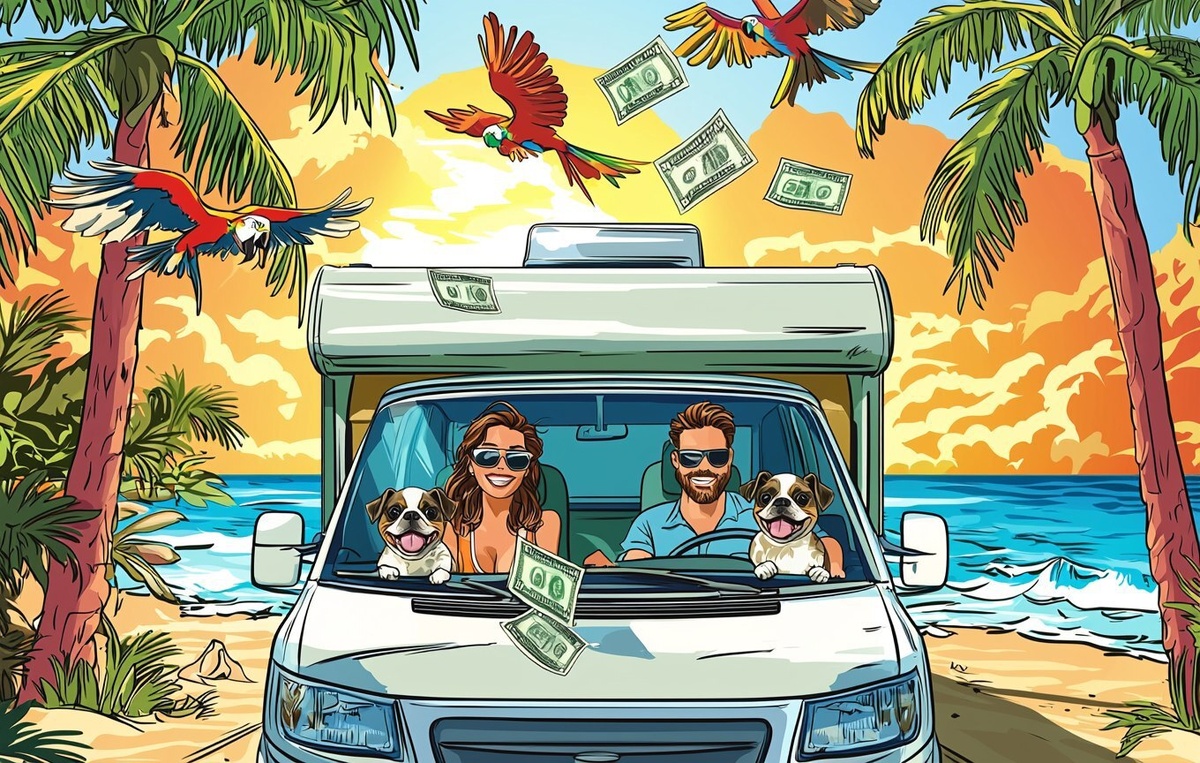Создано на основе запроса: Camper. A woman with brown hair is driving and a man sitting next around. Two small dogs are in the front seat. The first is a French bulldog, the second is a pinscher. Dollar bills are flying out of the back of the camper. Palm trees all around, parrots flying in the sky, beach and ocean on the horizon. Cartoon comic style, bright colors, cheerful mood, sun, fun summer atmosphere. --- Автоперевод: Турист Как тебе такая картинка? 🤔 https://dzen.ru/id/65c0c65c86e4f837c27b24d7 #ИИ #AI #нейросеть #midjourney #art