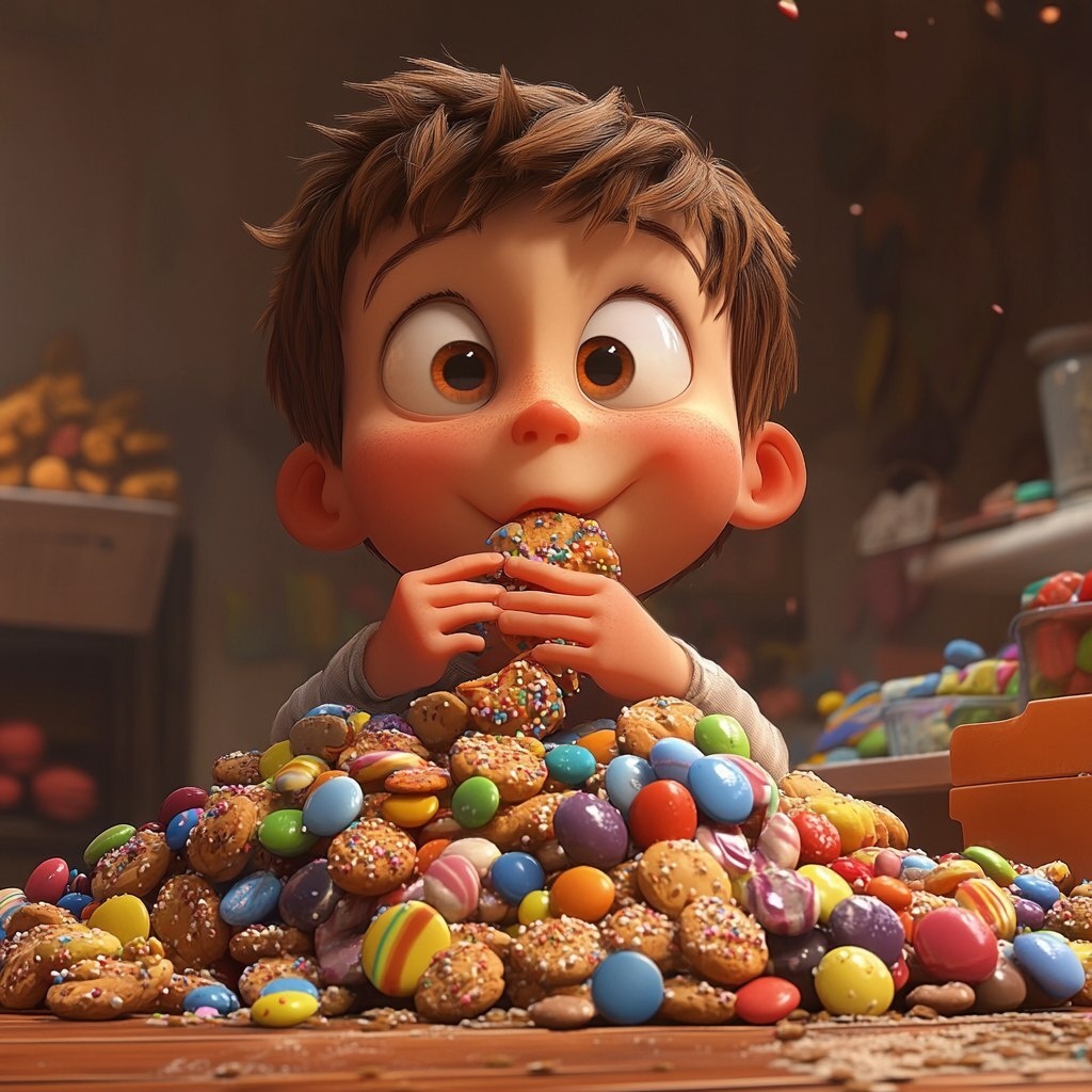 Создано на основе запроса: young boy eating a pile of candy and cookies, pixar style