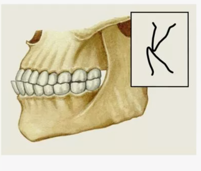 VI. Рассмотрим на рисунке другую патологию. Прогеническим прикус. Здесь видно двойное нарушение границ. Режущий край нижних резцов расположен впереди верхних резцов. На энергетическом уровне прошлая жизнь человека с подобным прикусом говорит о нарушении субординации в родовой системе дважды. Человек ушел со своего нуля- ребенок, относительно родителей. Перескочил уровень родителей и в данной позиции защищает их. А кто является защитой (крышей) родителей на самом деле ? Конечно их родители, бабушки и дедушки. Таким образом человек встал на уровень своих бабушек и дедушек. При таком положении дел он ( владелец прикуса) потерял не только детско- родительский поток, он теперь конкурирует со своими бабушкой и дедушкой, учит сам своих родителей. Очень заносчив, спесив, даже агрессивен, не выносит конкуренции, всё знает, насильно навязывает своё мнение.Если ошибается, то виноват другой. Своих ошибок не видит и не признает. Такой характер может проявляться явно, а может и не проявляться ( кип
