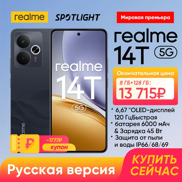 📌 3 скрытых недостатка, о которых молчат продавцы! Realme 14T 5G — новинка апреля 2025 года, сочетающая ёмкий аккумулятор, яркий AMOLED-экран и защиту от воды/пыли по стандарту IP69 29. Экран - 6.67" AMOLED, 120 Гц, 2100 нит Процессор - MediaTek Dimensity 6300 Батарея - 6000 мАч + зарядка 45 Вт Камеры - 50 МП (основная) + 2 МП (датчик глубины) Защита - IP69 (пыль, вода, горячие струи) Цена - От 14 360₽ Да, если: Нет, если: ⚠️ Совет: Проверяйте актуальные купоны (например, REALME2025) перед покупкой. 💬 А вы уже пробовали Realme 14T? Делитесь впечатлениями в комментариях! P.S. Обзор основан на тестах из открытых источников и отзывах первых покупателей. Цены актуальны на май 2025.