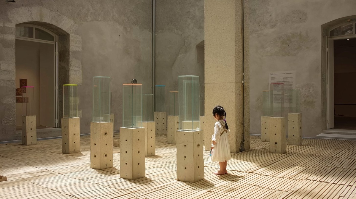 Создано на основе запроса: installation art in a tiny mini exhibition space, diffetent hight and thickness of concrete pillar with class boxes on the top , there are plenty of holes of the glass box, one little girl put her hand inside the glass box, factory grey concrete interior background, warm lighting background design --- Автоперевод: Установка искусства в крошечном мини -выставочном пространстве, различия и толщина бетонной колонны с коробками класса сверх Какое твое мнение? 🤔 https://dzen.ru/id/65c0c65c86e4f837c27b24d7 #ИИ #AI #нейросеть #midjourney #art