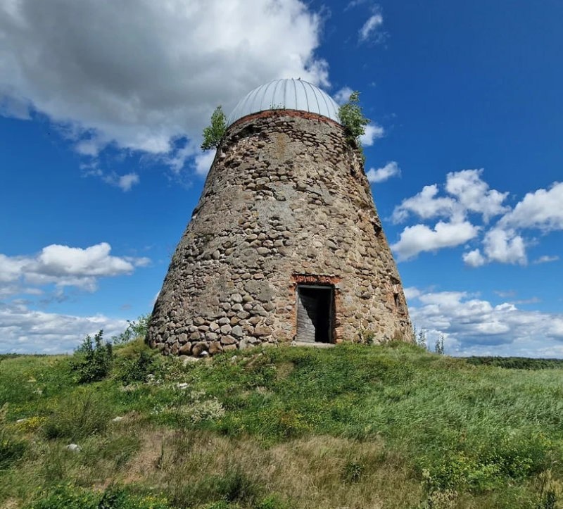 🖤 Ветряная мельница словно с другой планеты. Мельница находятся в Торново, на берегу р. Дитва, вдали от жилого сектора, за мостом. Мельница построена в нетипичном архитектурном стиле из бутового камня. Раньше была крыша и лопасти, сделанные из дерева. К сожалению, во время пожара в 1990-х годах они сгорели. Для сохранности крышу перекрыли жестяным куполом. 😎Гродненская область, Лидский район, Тарновский сельсовет #гродно_вандруй ☕️ Вандруй | Подписаться