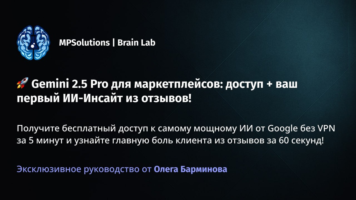 🔥 Узнайте ГЛАВНУЮ боль ваших покупателей за 60 секунд с помощью AI! (Делюсь инструментом + доступом) На связи Олег Барминов. Часто ловите себя на мысли: "Что НЕ ТАК с моей карточкой на WB/Ozon?", "Почему CTR низкий?", "Как понять, что улучшить, чтобы продажи РЕАЛЬНО выросли?" 🤔 Знакомо? Мы все ищем способы делать контент лучше, но часто действуем "по наитию" или тратим уйму времени на анализ. Нанимать же профильных маркетологов для глубоких инсайтов о клиентах – долго и дорого. Но есть другой путь! Последние полтора года я активно использую нейросети нового поколения для решения этих задач. И хочу поделиться с вами первым, очень мощным и практическим шагом, который вы можете сделать уже сегодня. Я говорю о Google Gemini 2.5 Pro – это AI, который (по моему опыту и тестам) круче привычного ChatGPT для анализа маркетинговых задач на МП, да ещё и пользоваться можно бесплатно! У него гигантская база знаний и продвинутое "мышление", способное находить неочевидные инсайты. 🎁 Специаль