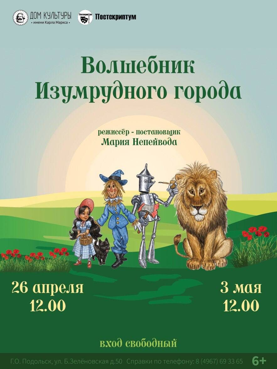 ✨ Премьера спектакля 🌈"Волшебник Изумрудного города»🌈 Средняя группа театрального коллектива «Постскриптум» приглашает 🗓️ 26 апреля в 12.00 и 🗓️ 3 мая в 12.00 🥰Про Элли и её песика Тотошку, про ураган и волшебный Изумрудный город💎 🚫 Возраст: 6+ 🏢 ДК им. Карла Маркса 📍 г. Подольск, ул. Большая Зелёновская, 50 💰 Вход свободный❗️ #webПодольск ✅ Мероприятия Подольск https://dzen.ru/id/66ed500f7b5671493eca3fd6 http://vk.com/podolsk_events http://dzen.ru/podolsk_events