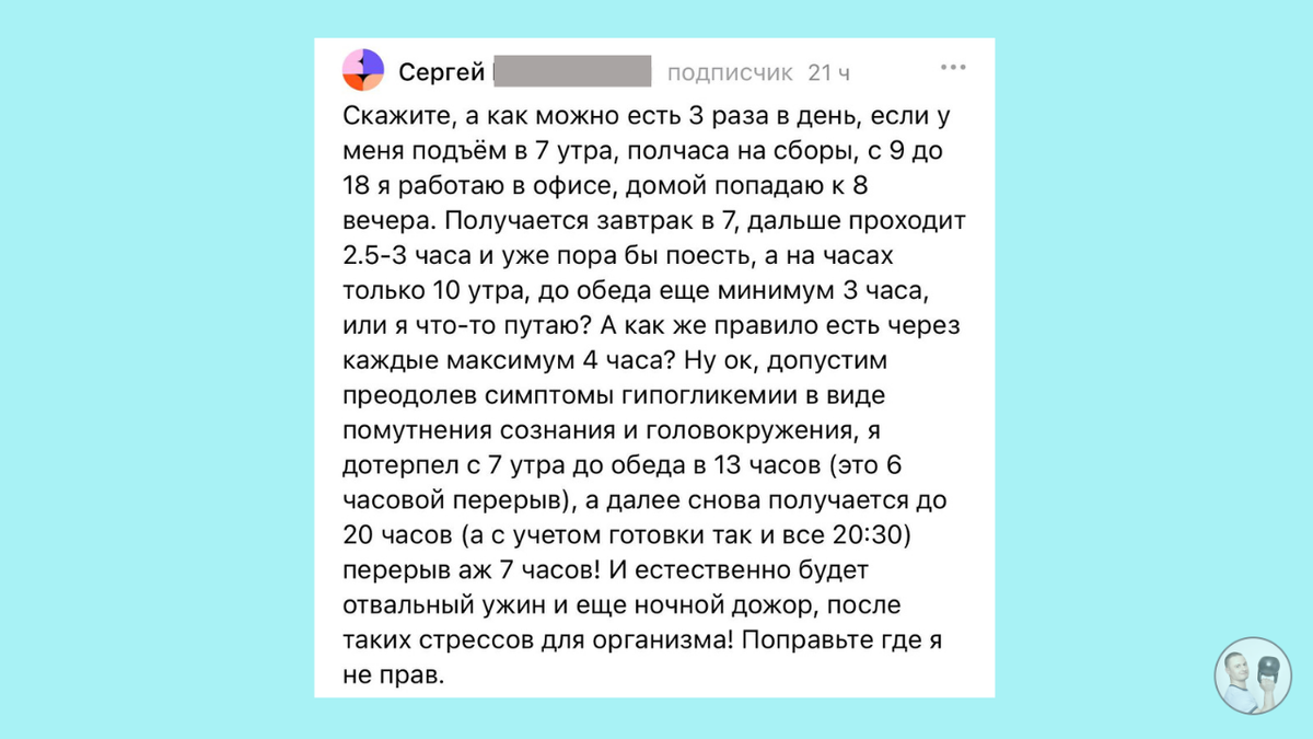 «Как можно есть 3 раза в день, если я ухожу в 8 утра, возвращаюсь в 8 вечера, и между приёмами пищи по 6–7 часов?! Это же вред, стресс и дорога прямиком в ночной жор!» Это не выдумка. Это реальный вопрос из комментариев под одной из моих публикаций. И, честно говоря, он настолько точный и важный, что я решил разобрать его в полноценной статье. Потому что это — боль тысяч людей: ⚠️ Сегодня я расскажу: 📌 Статья будет полезна абсолютна всем, "кто живёт на работе", а не только офисным работникам. Многие считают, что «три раза в день» — это строго 7:00, 13:00 и 19:00.