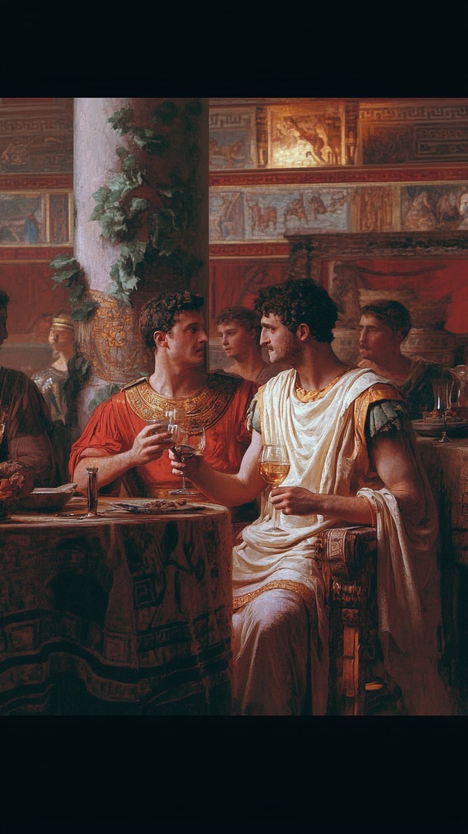 Создано на основе запроса: In a dimly lit Roman palace room, Caligula and Lepidus sit close, sharing wine and speaking intimately