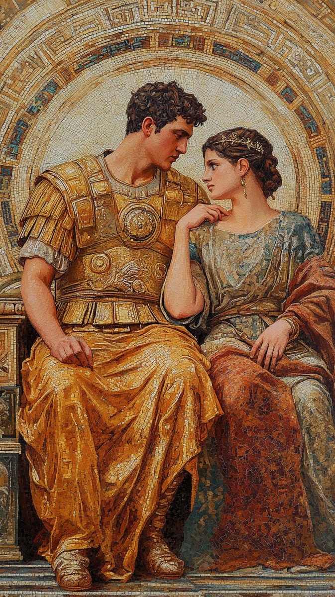 Создано на основе запроса: Emperor Caligula in golden robes sits on a lavish throne, gently touching the shoulder of his sister Drusilla. Their eyes meet closely. Courtiers nearby avert their eyes in discomfort. Ancient Roman mosaic style --- Автоперевод: Император Калигула в Золотых одеждах сидит на роскошном троне, осторожно касаясь плеча его сестры Друсиллы. Как тебе эта генерация? 🤔 https://dzen.ru/id/65c0c65c86e4f837c27b24d7 #ИИ #AI #нейросеть #midjourney #art