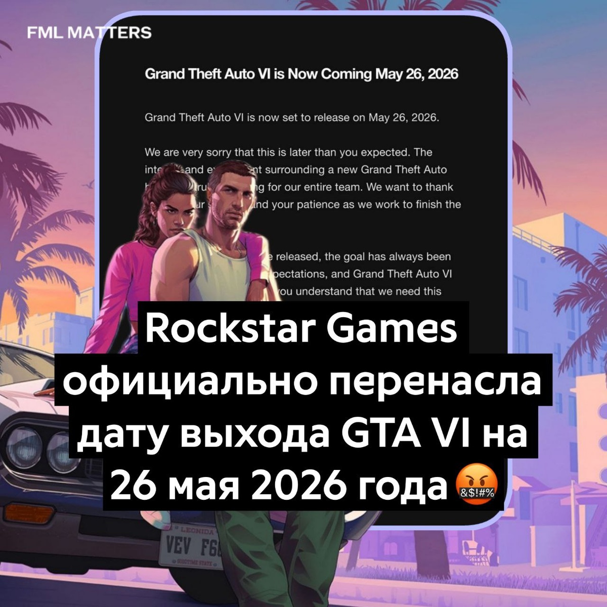 ❗️ GTA VI ВЫХОДИТ 26 МАЯ 2026 ГОДА! Игру официально перенесли. Rockstar Games приносит извинения за задержку и обещает игру высокого качества. 💀 FML MATTERS