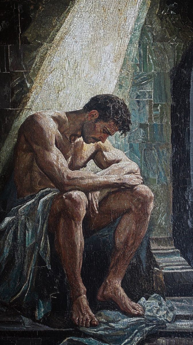 Создано на основе запроса: Lepidus sits hunched in a dark cell, arms around his knees. A faint beam of light enters from above. His expression is filled with regret and fear. Roman mosaic style --- Автоперевод: Лепиду сидит сгорбен в темной камере, обнимает колени. Хорошо вышло? 🤔 https://dzen.ru/id/65c0c65c86e4f837c27b24d7 #ИИ #AI #нейросеть #midjourney #art