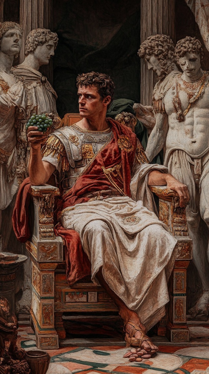 Создано на основе запроса: In the sanctuary of a Roman temple, Caligula sits on a throne between massive deity statues, holding grapes
