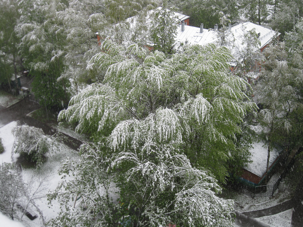 Аттракцион - русские горки, т.е. русская зима , захватывая дух, домчал до самого низа конструкции: мало не показалось никому. Сменивший суточный ливень в ночь под утро снегопад подкорректировал погодную историю на совесть, выйдя на рекорд. Утром чавкающая водно-снежная каша "обнадеживающе" встретила автомобилистов и пешеходов, рискнувших высунуть нос из теплых жилищ. Картина из развалившихся налево-направо стволов деревьев, обломанных веток с отчаянно-зеленой на белом фоне листвой предстала пред изумленной, отважно вылезшей на улицу публикой. Заснеженные ряды цветущих тюльпанов по клумбам стойко "держали фрунт". А в остальном - белым-бело, хорошим таким слоем по всем поверхностям, как в январе не было. Чисто. Пушисто. Не особенно тает. Пол дня поднявшийся еще сильнее ветер трепал кроны, выдувал выпавший снег ото всюду... И да, в результате вторая половина пятницы оказалась как обратная сторона медали. Иллюзия зимы, вам приснилось, сказал бы тот, кто не наблюдал утренний пейзаж во в
