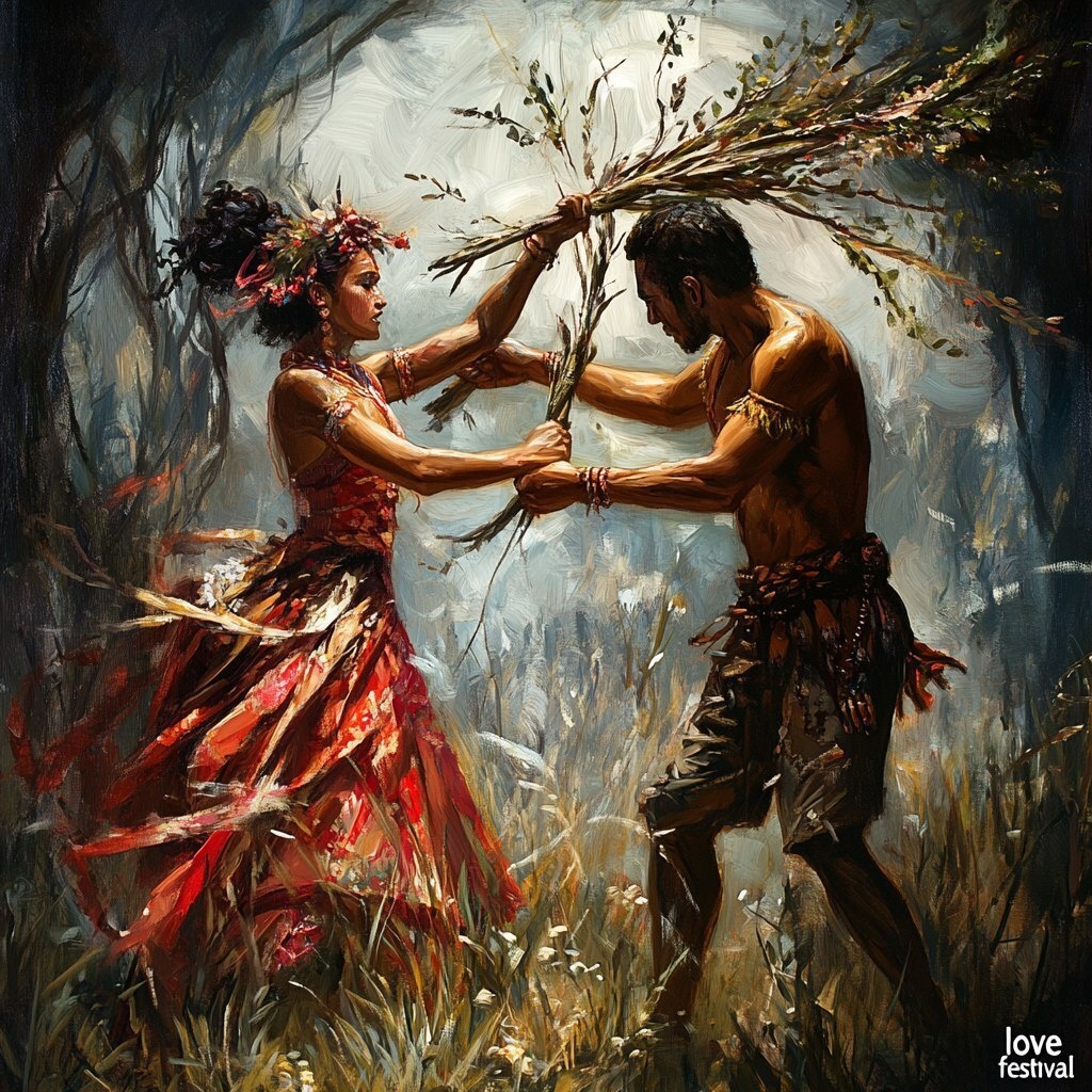 Создано на основе запроса: Create an image to illustrate the text: What country has a "love festival" where women symbolically whip men with branches? --- Автоперевод: Создайте изображение, чтобы проиллюстрировать текст: в какой стране есть «фестиваль любви», где женщины символически бьют мужчин с филиалами? Красиво вышло? 🤔 https://dzen.ru/id/65c0c65c86e4f837c27b24d7 #ИИ #AI #нейросеть #midjourney #art