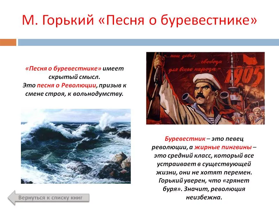 - Чайки, гагары, пингвин: Образы трусости, пассивности и обывательского равнодушия, контрастирующие с героизмом буревестника.
