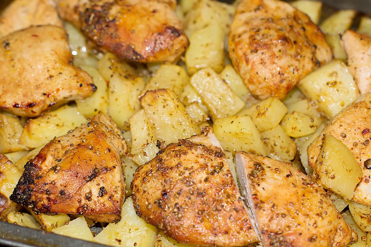 Из одной куриной тушки и 1,5-2 кг картофеля можно огромный противень наготовить, и на семью большую, и на гостей.